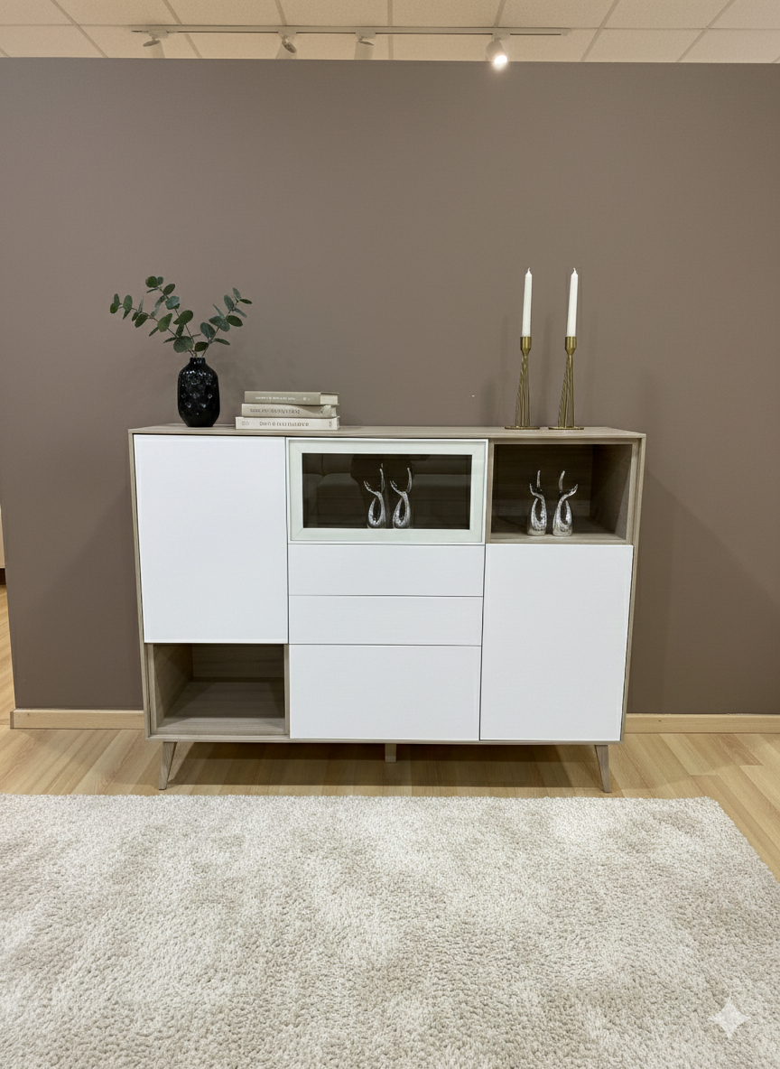 Aparador modular destaca por su diseño versátil y modular, combinando zonas de almacenaje cerrado con espacios abiertos para decoración, adaptándose a diferentes necesidades y estilos de vida. Medidas: Alto 105 cm · Fondo 47,4 cm · Ancho 180 cm