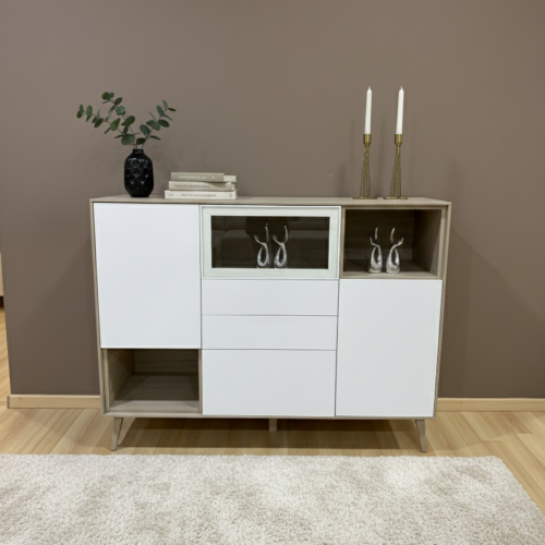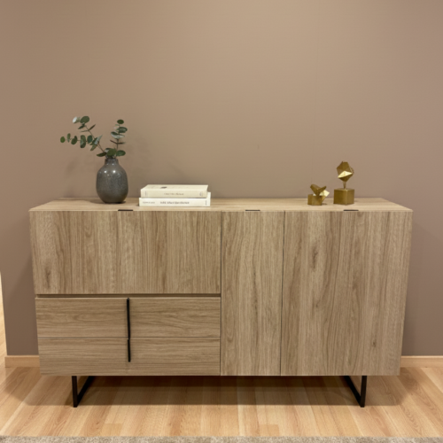 Aparador negro pensado para maximizar el almacenaje en salón o comedor sin renunciar al diseño. Su estructura permite organizar de forma eficiente mientras aporta presencia estética y equilibrio visual al espacio. Medidas: Alto 90 cm · Ancho 160 cm · Fondo 49 cm