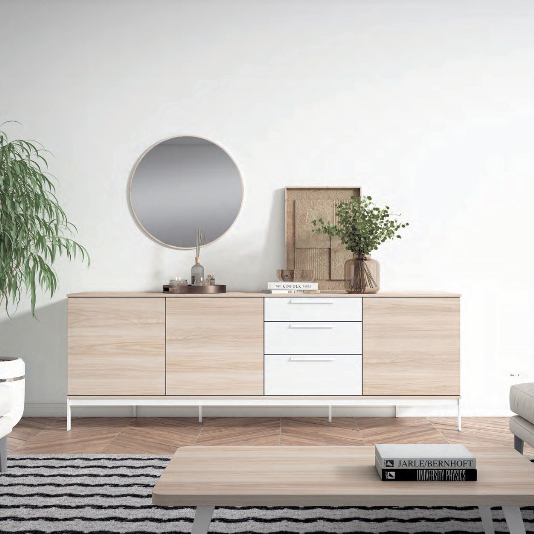 Aparador con patas, puertas y cajones en colores California y blanco mate. Con 220 cm de largo, ofrece amplio espacio para almacenamiento y organización en tu salón o comedor. Además, opcionalmente puedes añadir el espejo redondo, para complementar el conjunto.