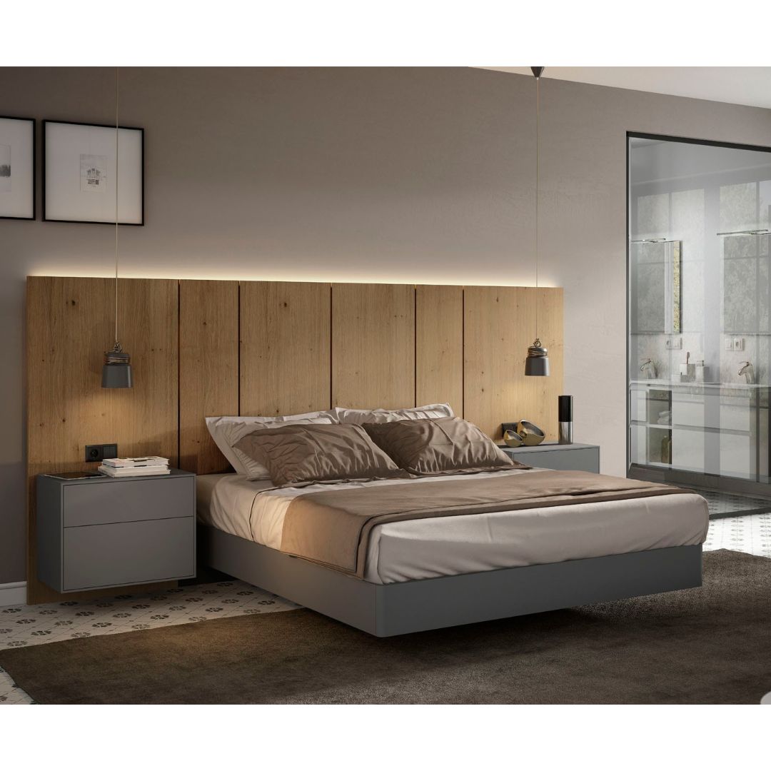 Conjunto de dormitorio compuesto por cabecero de 150 cm de plafones lisos y mesita colgada de 2 cajones. Su diseño combina acabado roble viejo piedra con ceniza mate.