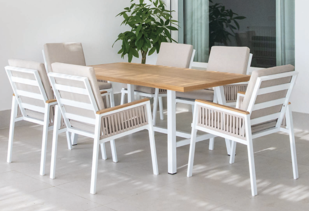 Comedor Misisipi para exterior con sillón misisipimesa misisipi | 6 sillones fabricado en aluminio, madera en color beige y blanco cojinería de olefina color beige