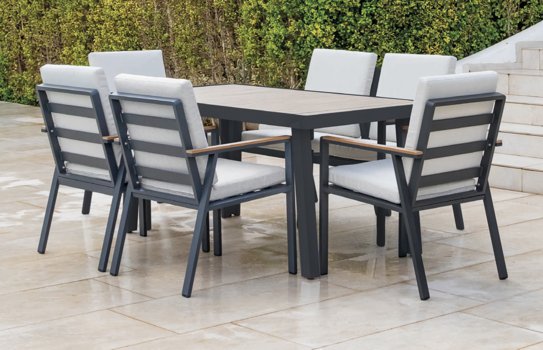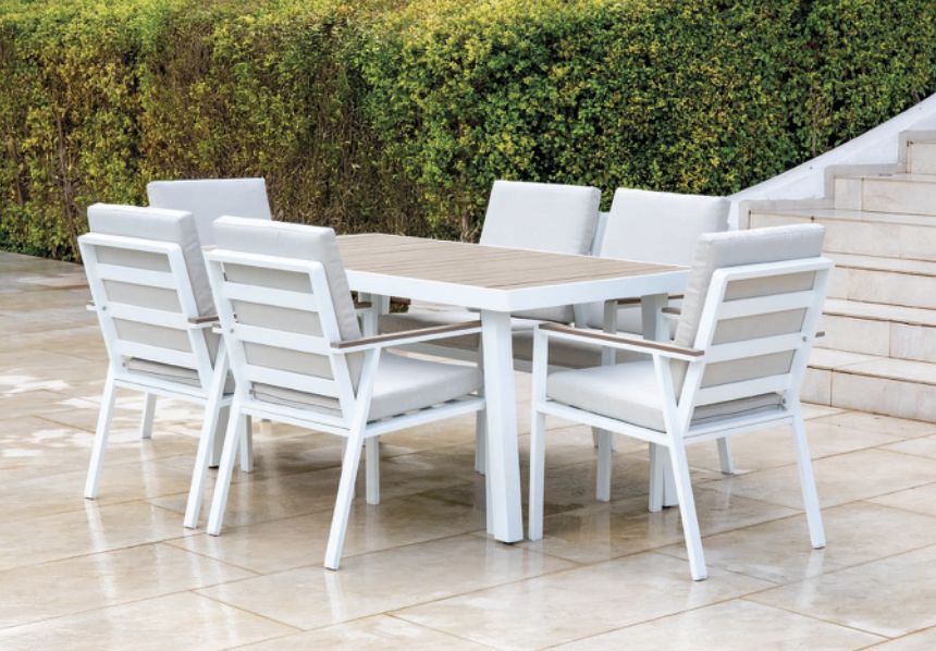 Comedor Turquía de la colección exterior Majestic Garden. compuesto por sillón turquíamesa turquía | 6 sillones. Fabricado en aluminio, madera, poliéster. con acabados en color beige y blanco y antracita. Reposabrazos de resina imitación madera. Tablero de resina imitación madera. Medidas: 157,5×89,5×75 cm | 58x68x86 cm.