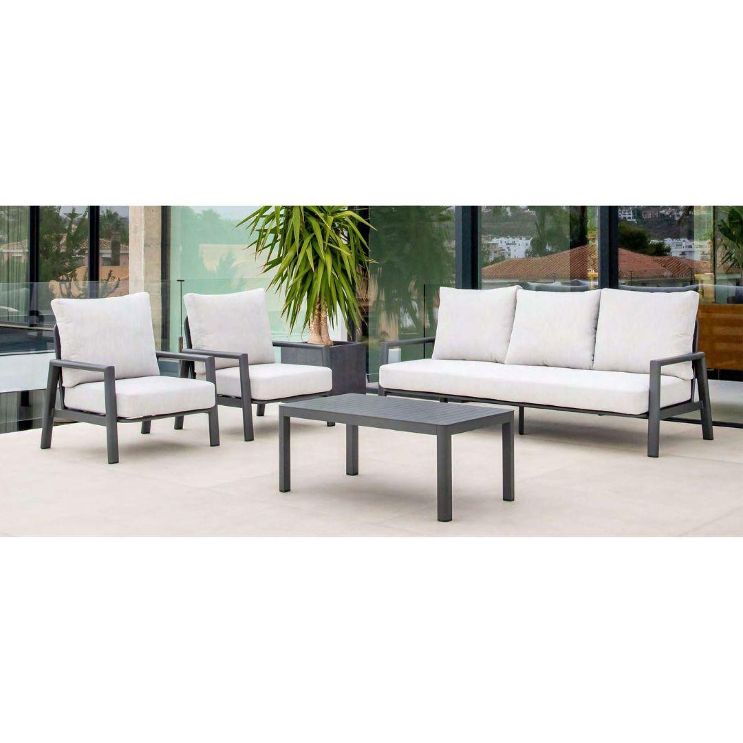 Elegante conjunto de exterior fabricado en aluminio color antracita, con cojines de olefina en tono gris.