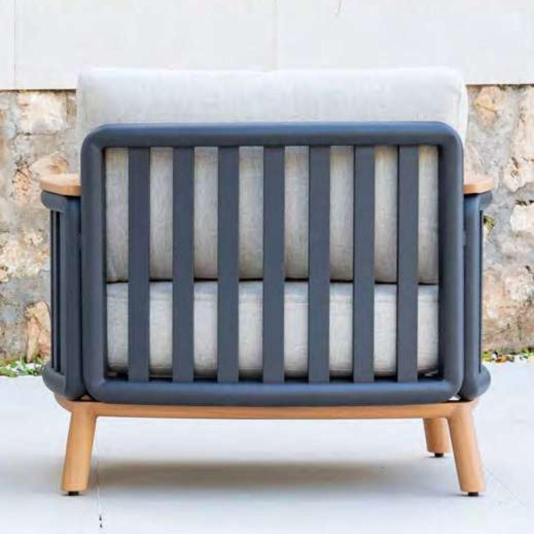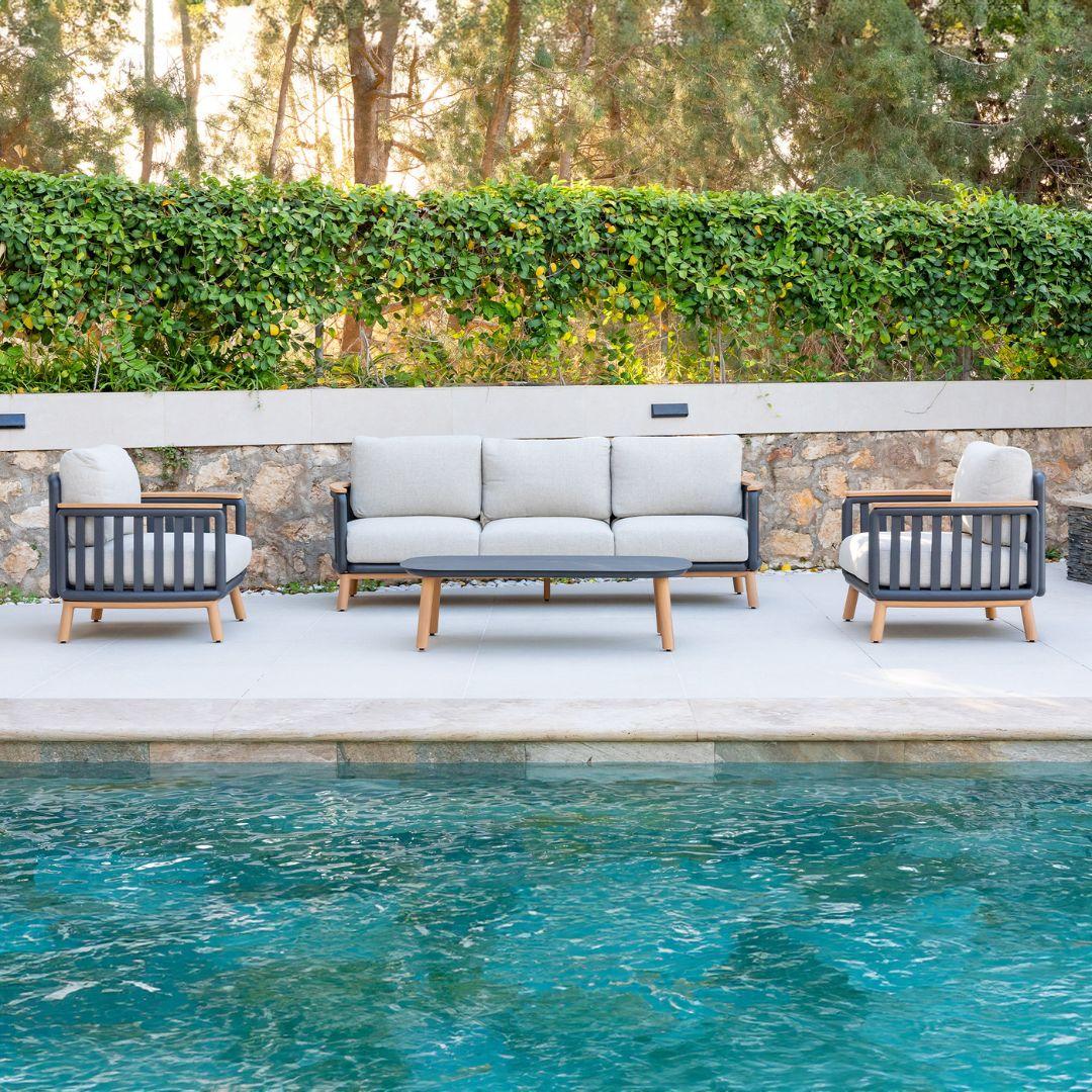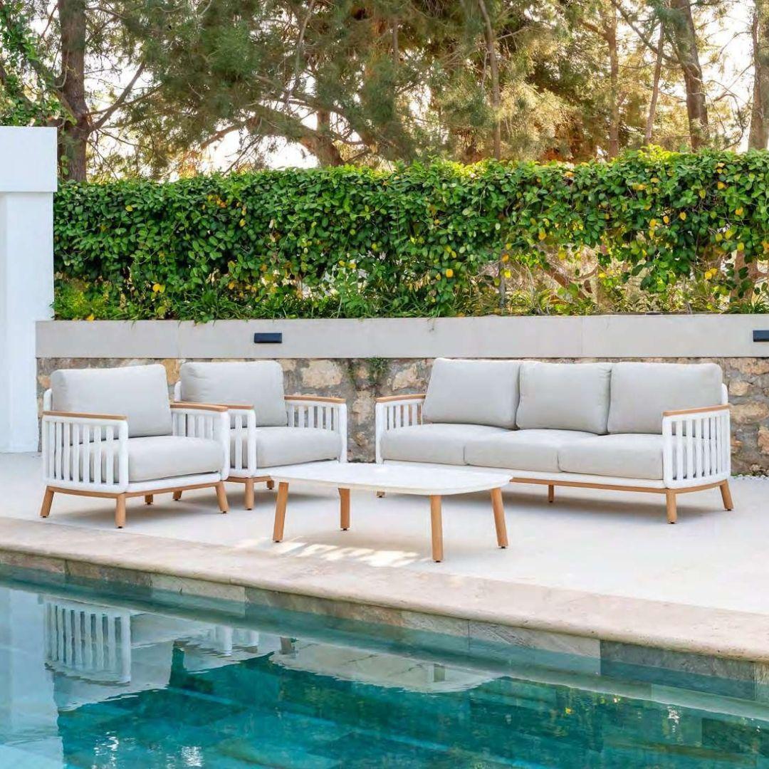 Conjunto de jardín Riga de 5 plazas fabricado en aluminio con imitación madera. Disponible en color blanco o antracita.