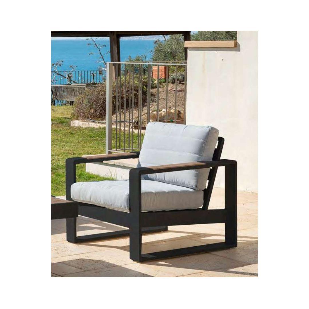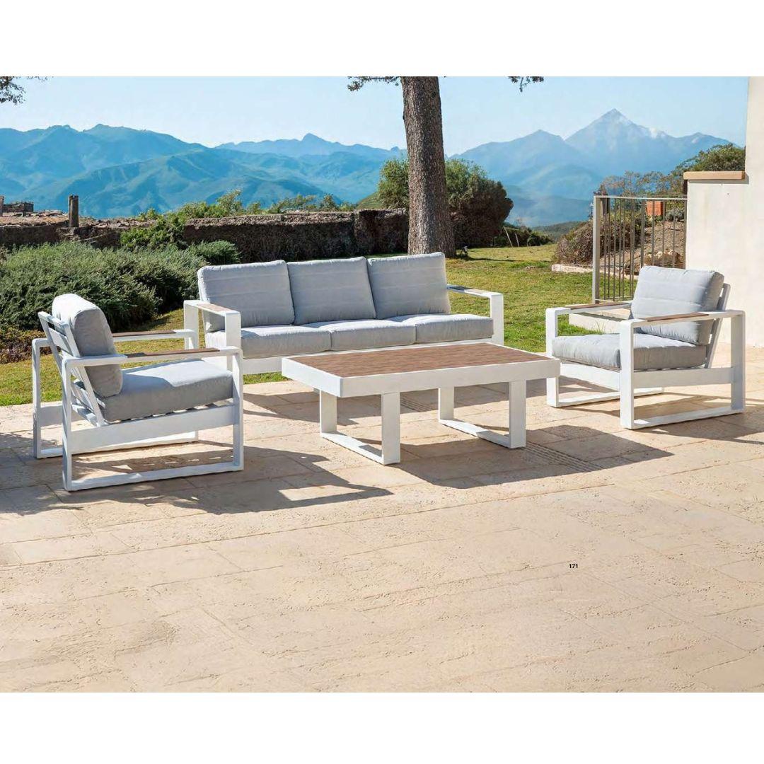 Conjunto de mobiliario de exterior compuesto por un sofá de 3 plazas, dos sillones individuales y una mesa de centro. Estructura fabricada en aluminio, disponible en blanco o antracita, con reposabrazos y tablero de mesa en resina con acabado imitación madera. Cojinería en tejido olefina color gris claro.