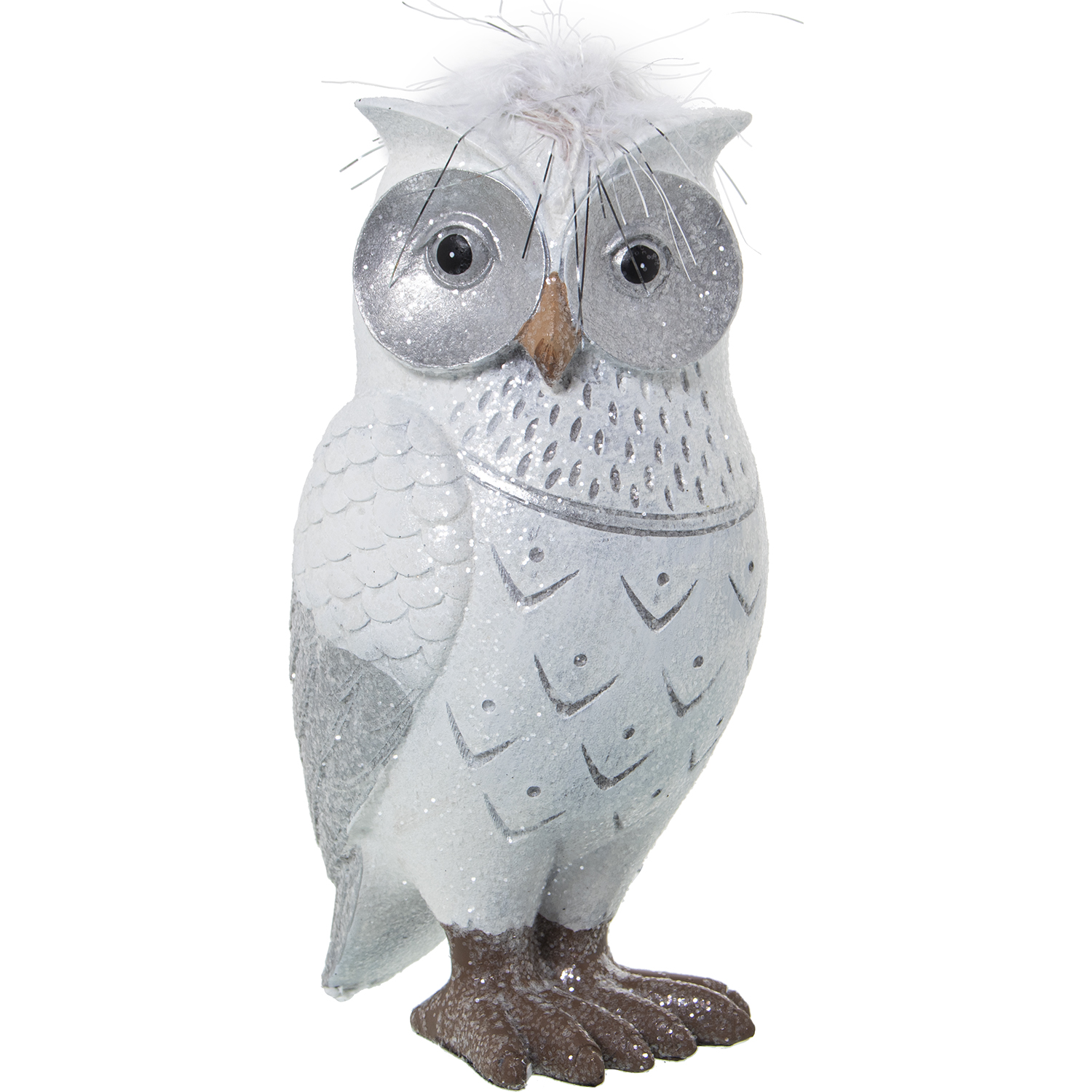 FIGURA RESINA BÚHO BLANCO/PLATDO C/PLUMA ARTIFICIAL 9X9X17CM