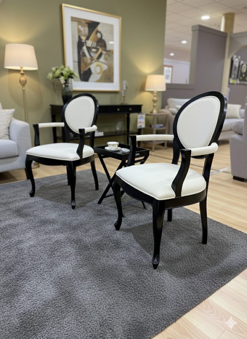 Tipo: Pareja de sillones o sillas con brazos de estilo señorial, ideales para aportar presencia y elegancia al espacio. Estilo: Diseño clásico y sofisticado con estructura de madera curvada que recuerda al mobiliario tradicional de inspiración francesa. Color y contraste Elegante combinación de armazón en negro satinado y tapizado en blanco o crema claro, creando un contraste refinado y atemporal. Detalles: Respaldo ovalado y patas tipo cabriolé que aportan una estética distinguida y decorativa. Uso: Piezas ideales para crear un rincón de lectura, acompañar una mesa auxiliar o funcionar como asientos de apoyo en un salón elegante. Medidas: Alto respaldo 100 cm · Alto asiento 50 cm · Ancho silla 62 cm