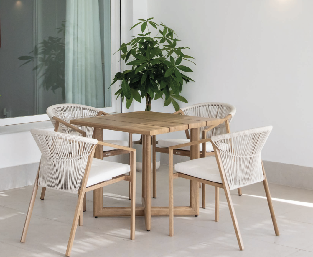 Mesa Bambari de la colección exterior Majestic Garden. Fabricado en aluminio, madera. Producto de exterior de la colección Bambari. Diseñado para comedores de exterior. Medidas: 82x82x75 cm.