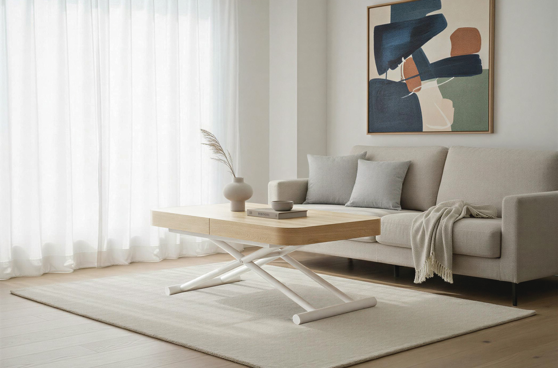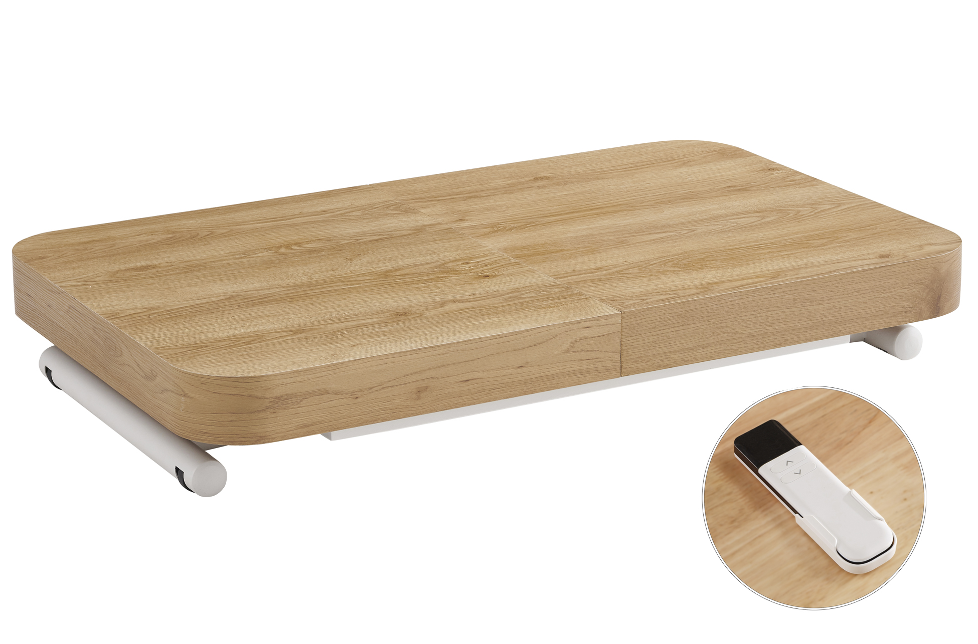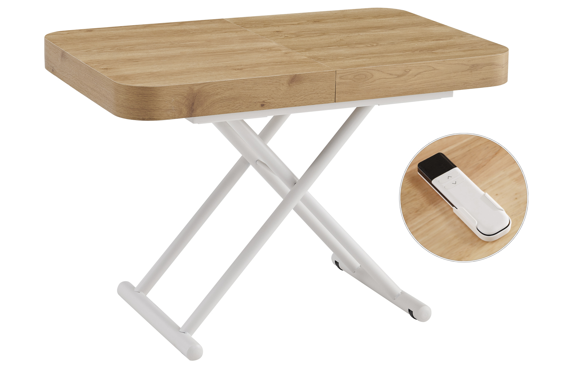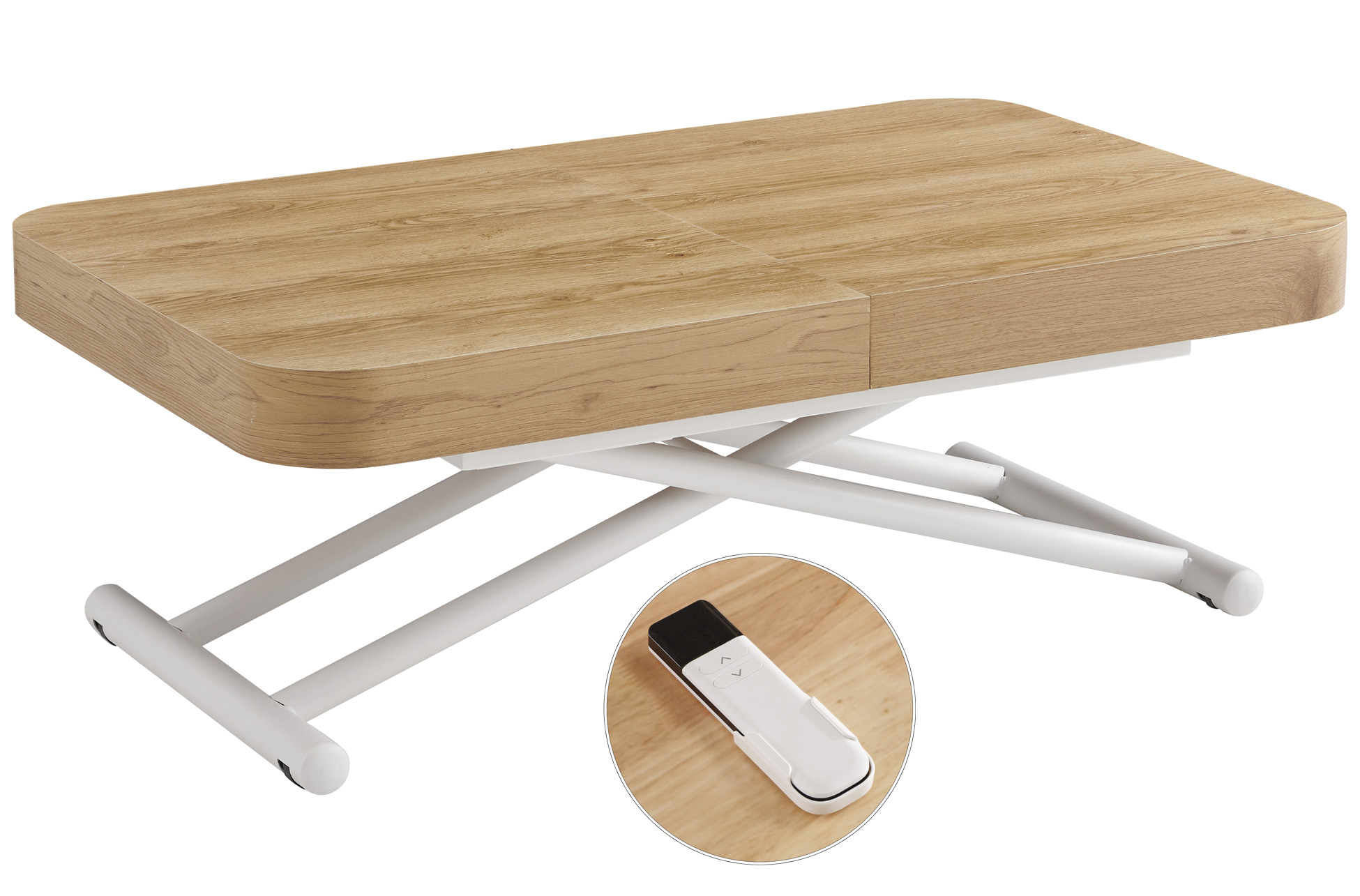 MESA CENTRO EXTENSIBLE 120 – 160 – 200 CM CON ELEVACION ELECTRICA TURIN OAK / BLANCO Mesa centro elevable y extensible.