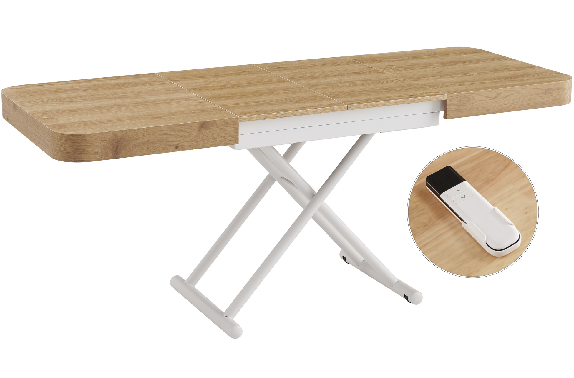 MESA CENTRO EXTENSIBLE 120 – 160 – 200 CM CON ELEVACION ELECTRICA TURIN OAK / BLANCO