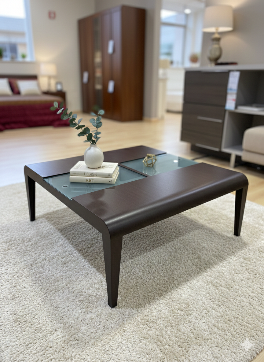 Mesa centro wengué con diseño contemporáneo pensada para integrarse en salones actuales. Ofrece una combinación equilibrada entre estética, funcionalidad y durabilidad, adaptándose tanto a uso diario como a necesidades decorativas. Medidas: 90 x 90 cm · Alto 38,5 cm
