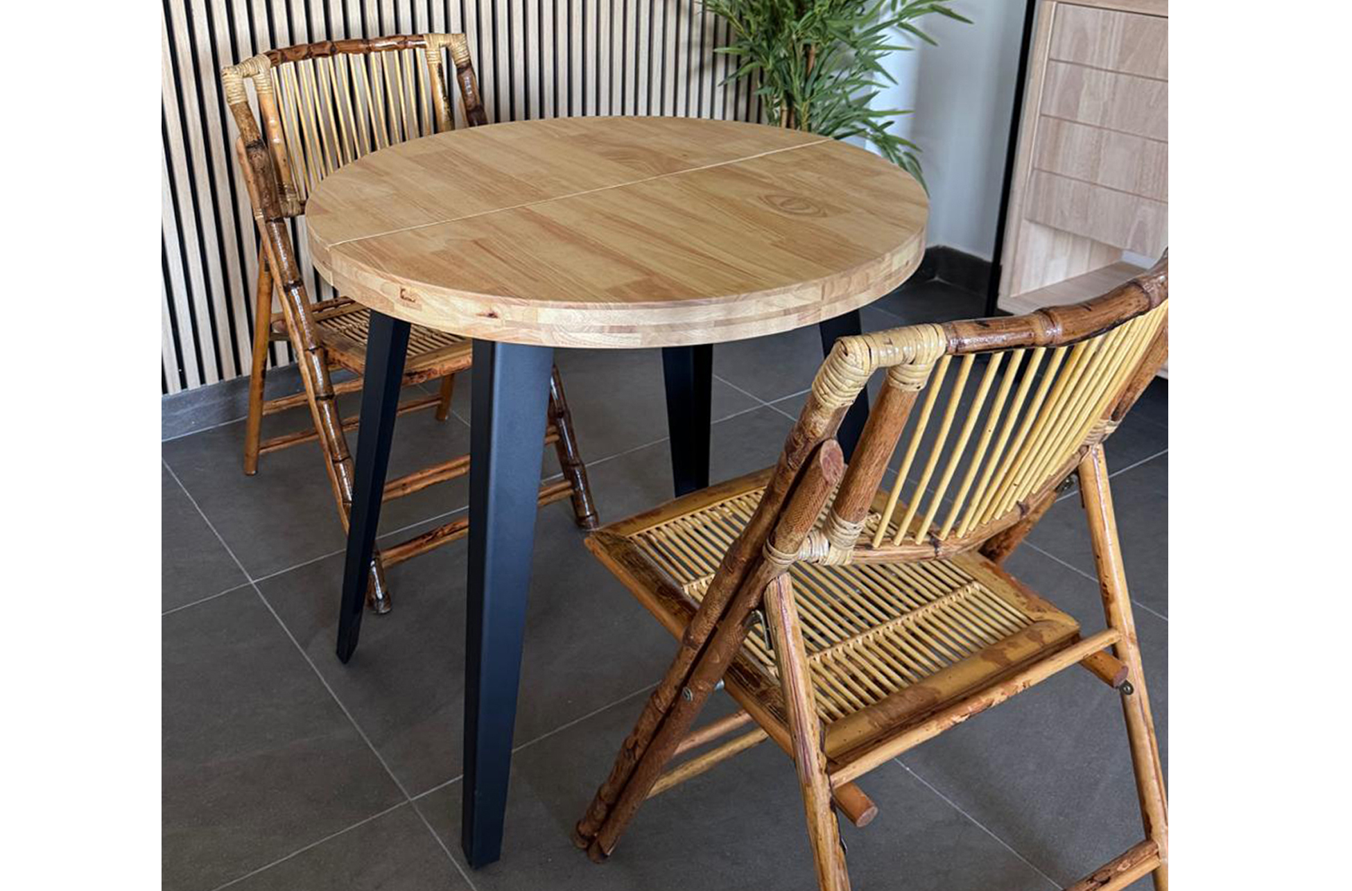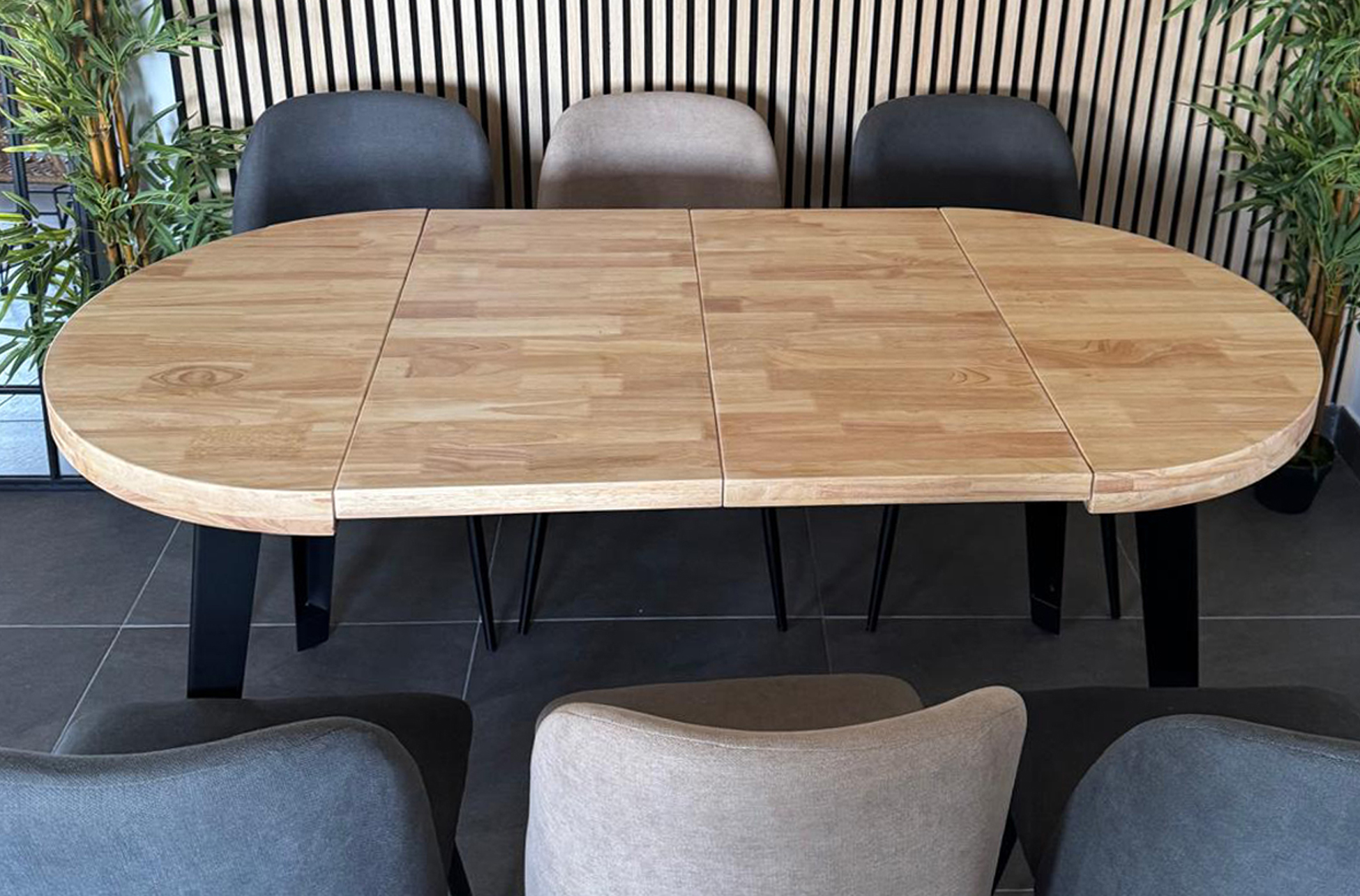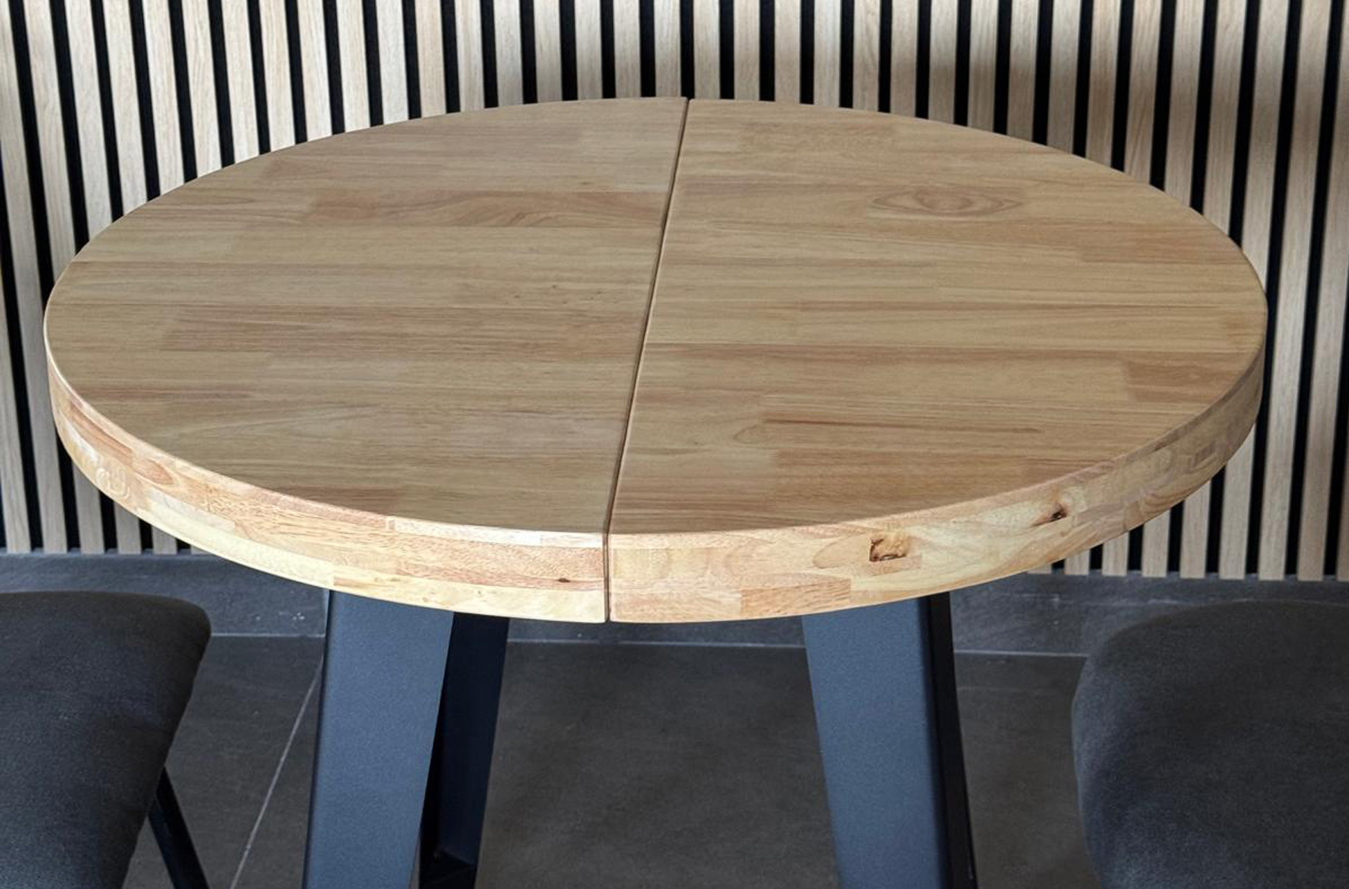 MESA COMEDOR REDONDA EXTENSIBLE BERG 80 – 120 – 160 CM ROBLE NORDISH / NEGRO. Tapa extensible en madera de roble.