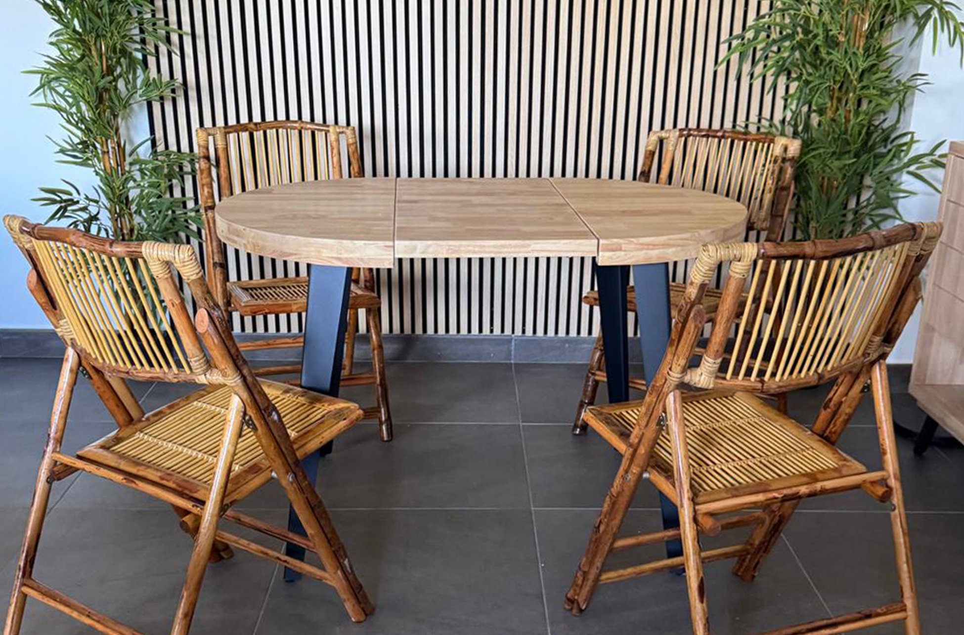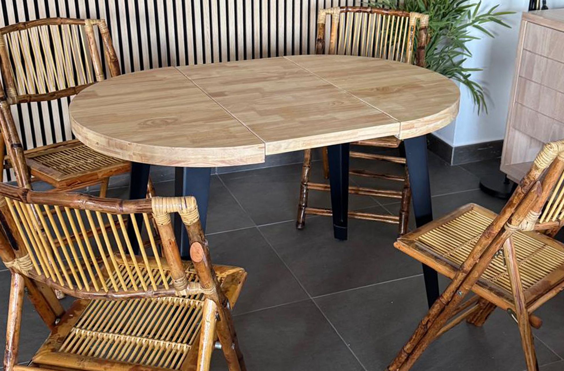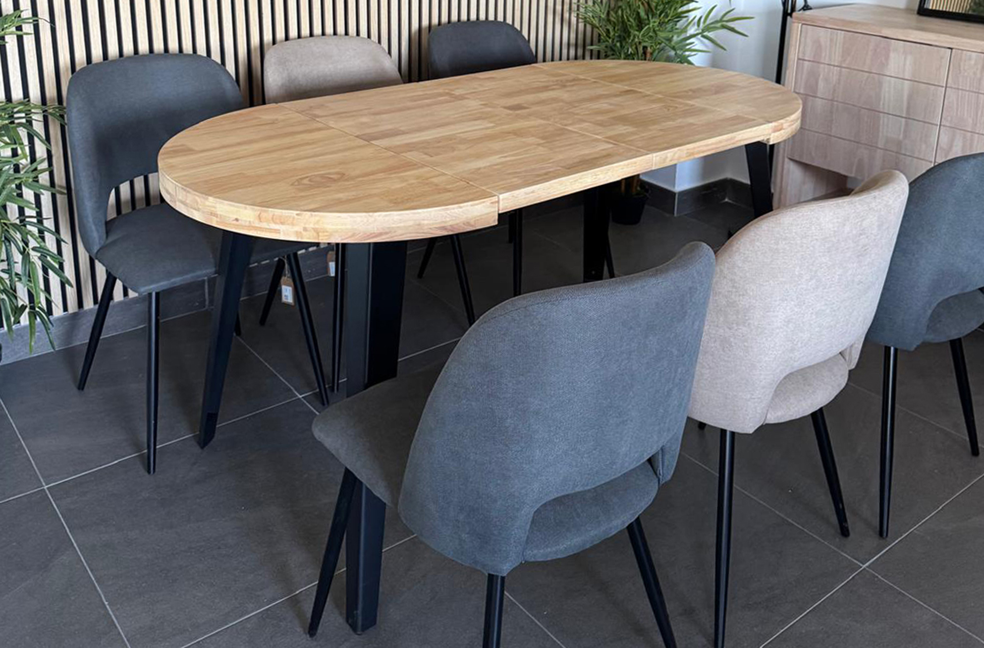MESA COMEDOR REDONDA EXTENSIBLE BERG 80 – 120 – 160 CM ROBLE NORDISH / NEGRO. Tapa extensible en madera de roble.