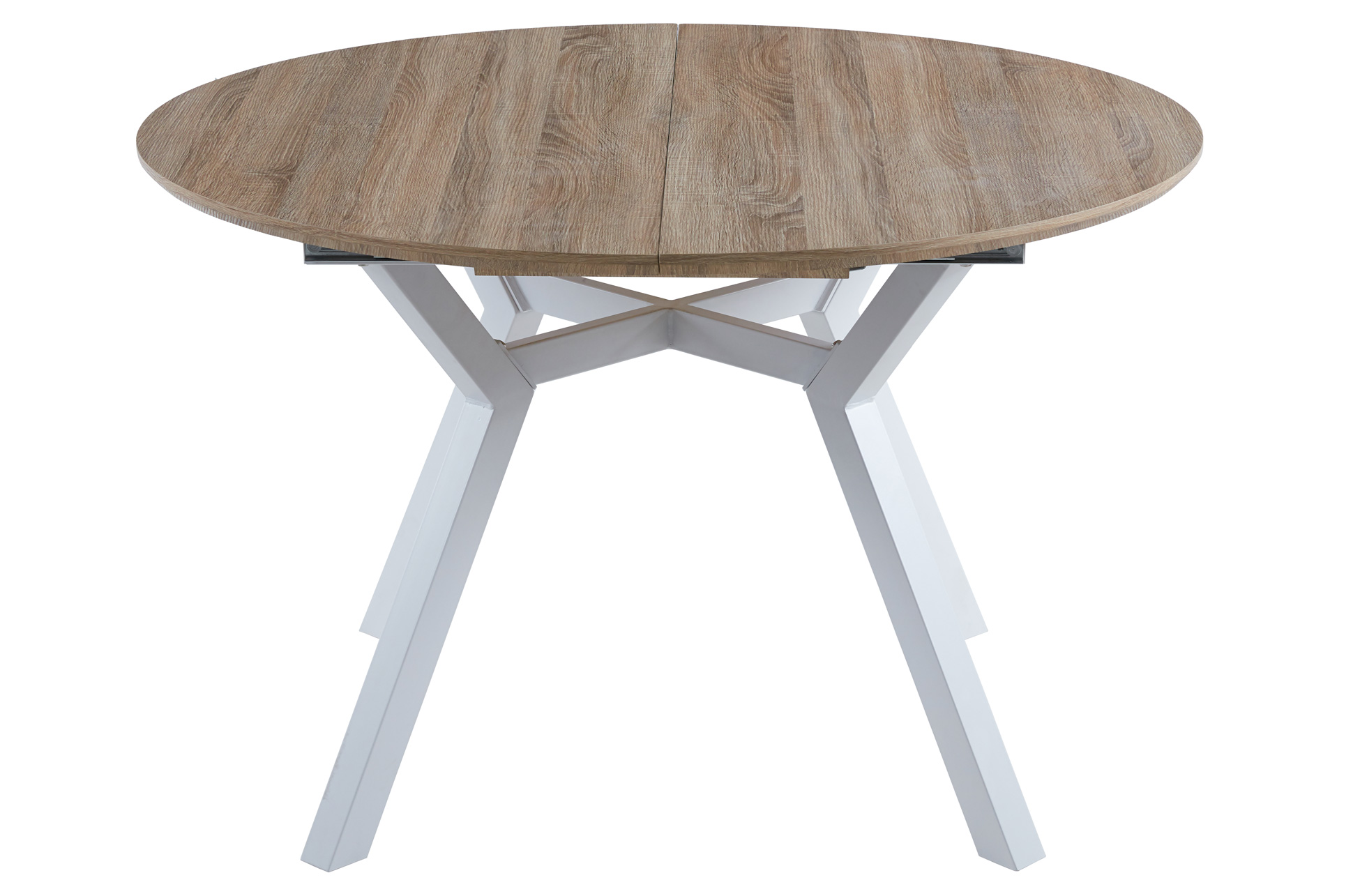 MESA COMEDOR REDONDA EXTENSIBLE DELTA 120 – 160 CM OAK / BLANCO. Extensible mediante guias metálicas.