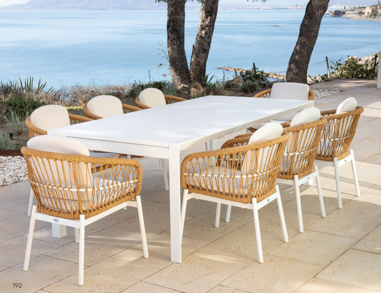 Mesa Damasco de la colección exterior Majestic Garden. Fabricado en aluminio, cuerda. con acabados en color beige y blanco y natural. Trenzado en cuerda de color natural. Medidas: 230/340x104x75 cm.