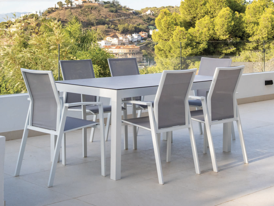 Mesa Luxor de la colección exterior Majestic Garden. Fabricado en aluminio, textilene, cerámico. con acabados en color blanco y antracita y gris. Asiento de textilene color gris. Asiento de textilene color antracita. Tablero cerámico imitación piedra. Medidas: 160x80x75 cm.