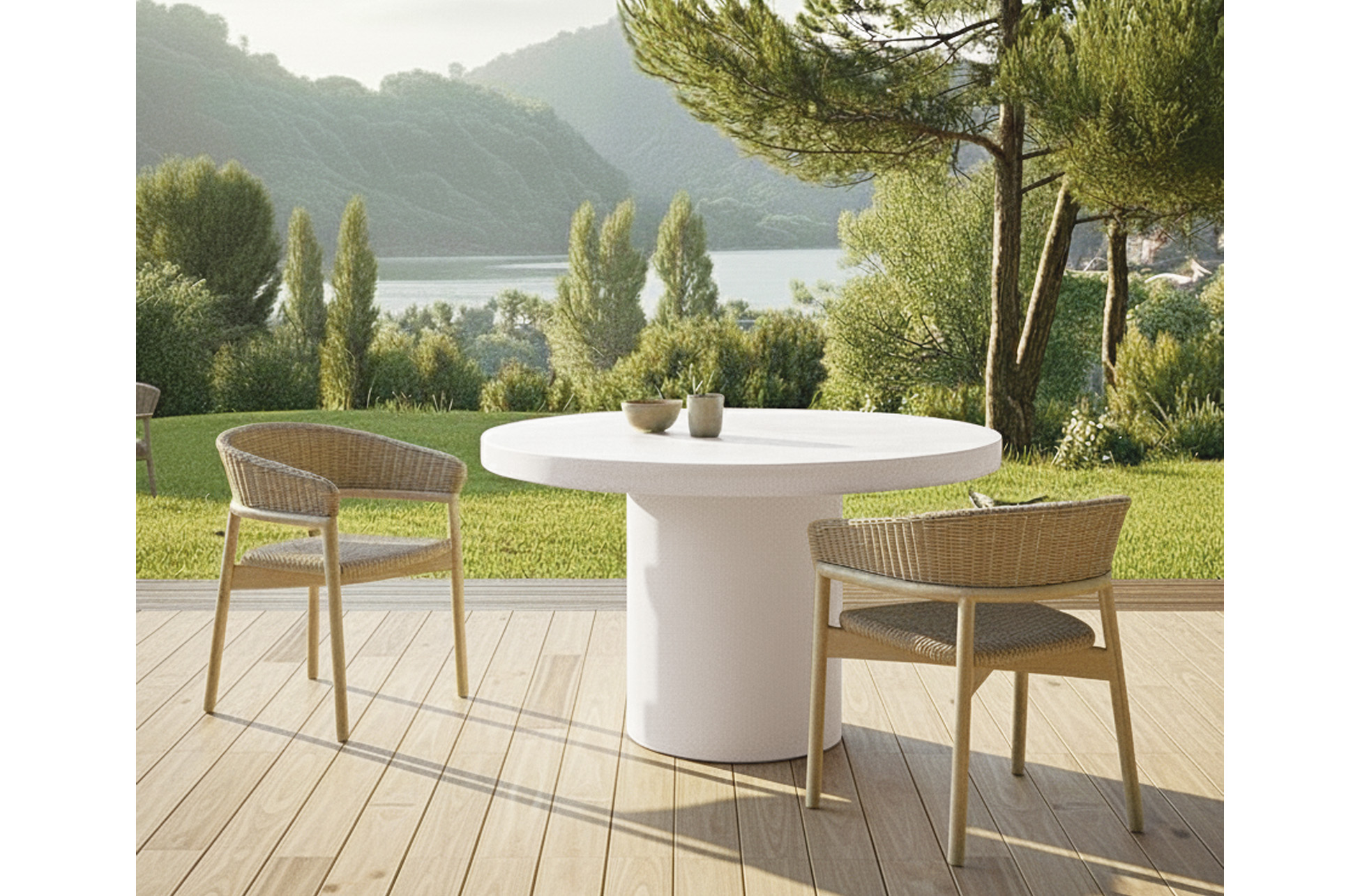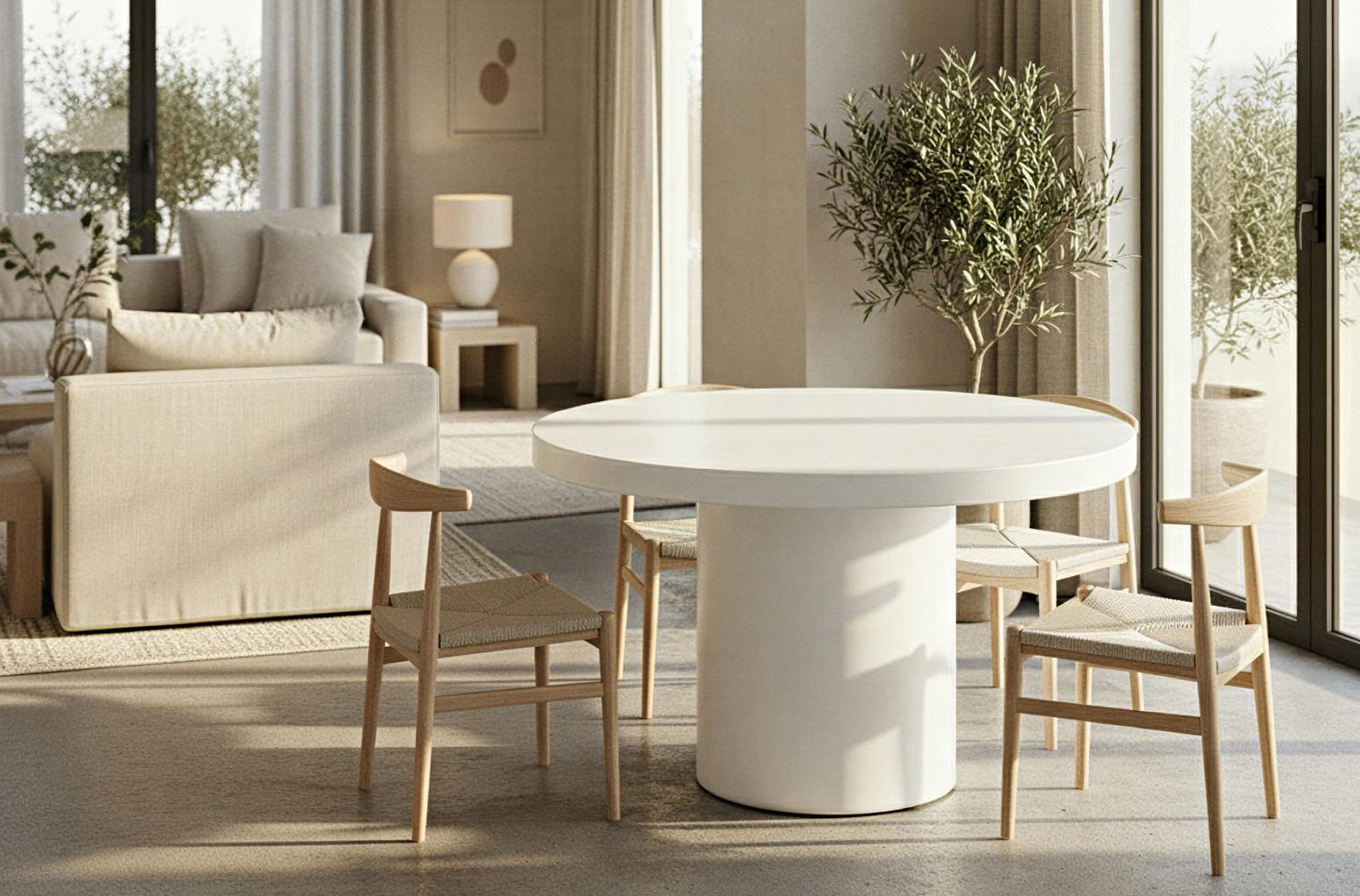 MESA REDONDA 120 CM MICROCEMENTO BLANCO Mesa redonda exterior bajo techo / interior.