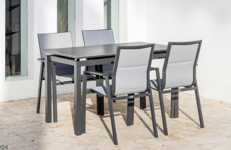 Mesa Siena de exterior fabricado en aluminio, cerámico en color blanco y antracita tablero extensible cerámico imitación piedra gris