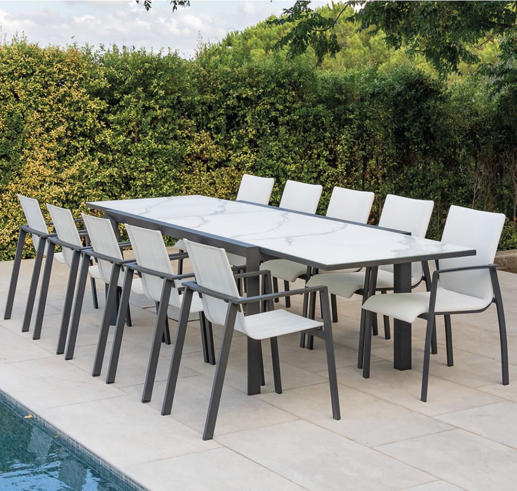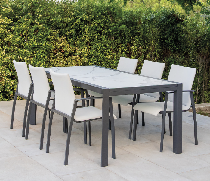 Mesa Volcano de la colección exterior Majestic Garden. Fabricado en aluminio, textilene, batyline. con acabados en color blanco y antracita y gris. Asiento de textilene en color blanco. Asiento de batyline en color gris. Tablero extensible de cristal cerámico imitación mármol. Medidas: 200/320x100x75 cm.