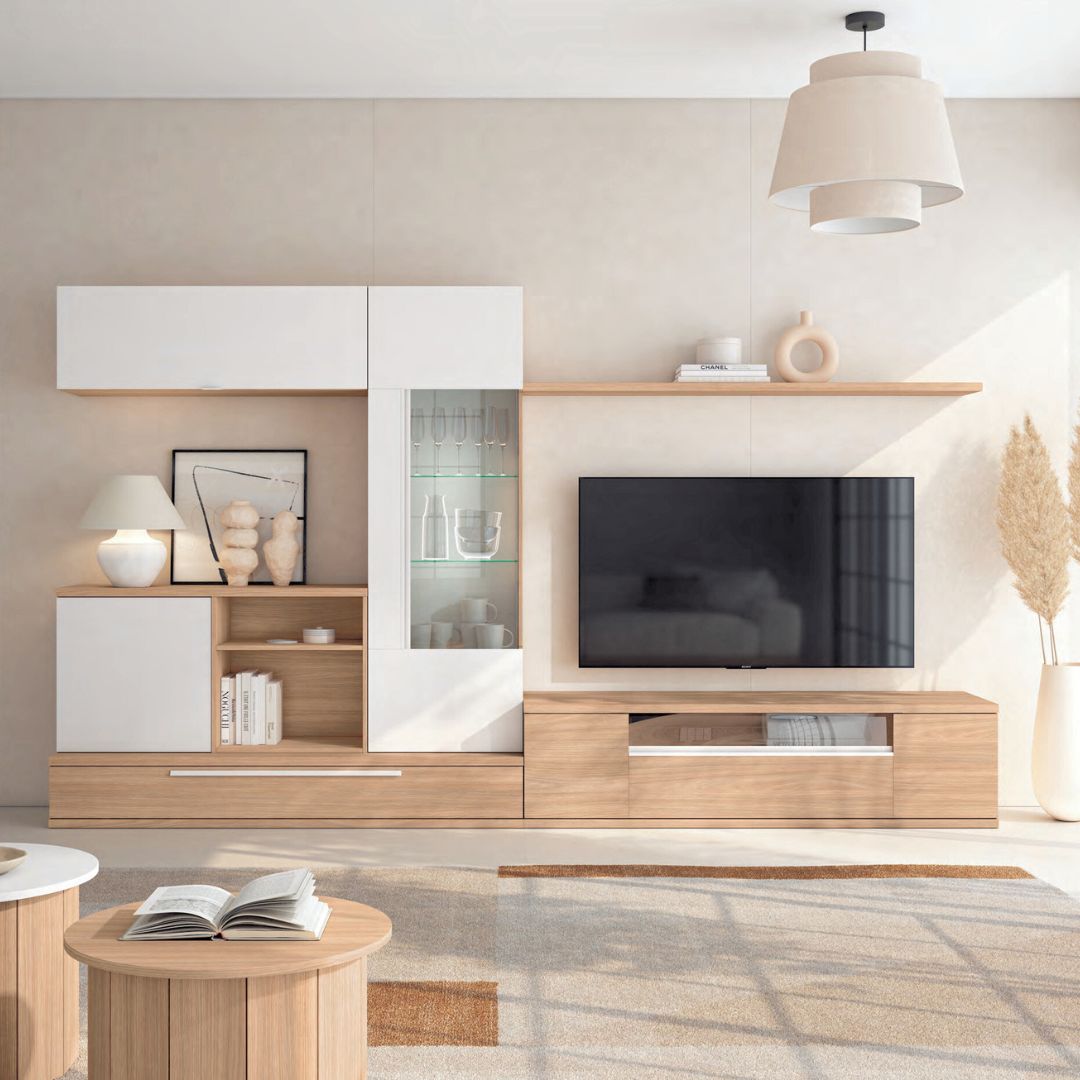 Modular de salón con vitrina. Diseño en colores Siroco y blanco mate, con tirador bold blanco.