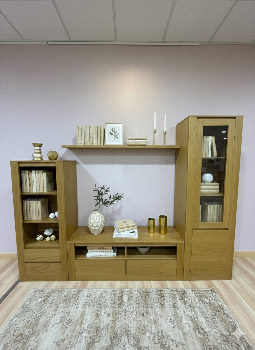 Incluye composición completa de salón, configurando un conjunto de salón totalmente equipado que permite organizar televisión, almacenaje y decoración en un mismo espacio de forma coherente y estética.