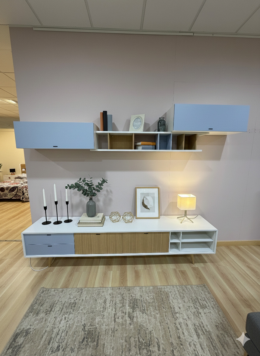Incluye mueble tv + módulos altos + estante, configurando un conjunto de salón totalmente equipado que permite organizar televisión, almacenaje y decoración en un mismo espacio de forma coherente y estética.