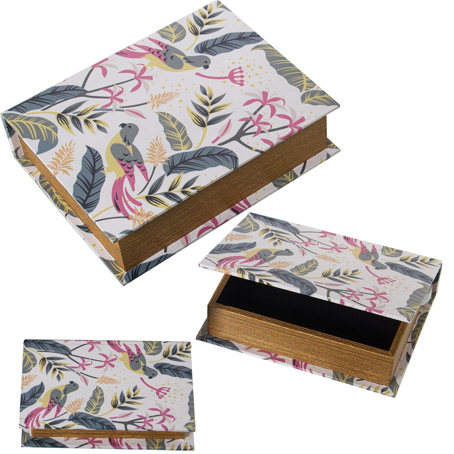 SET 3 CAJAS LIBROS DECORADOSMA/LONA POLIÉSTER LORO+HOJAS