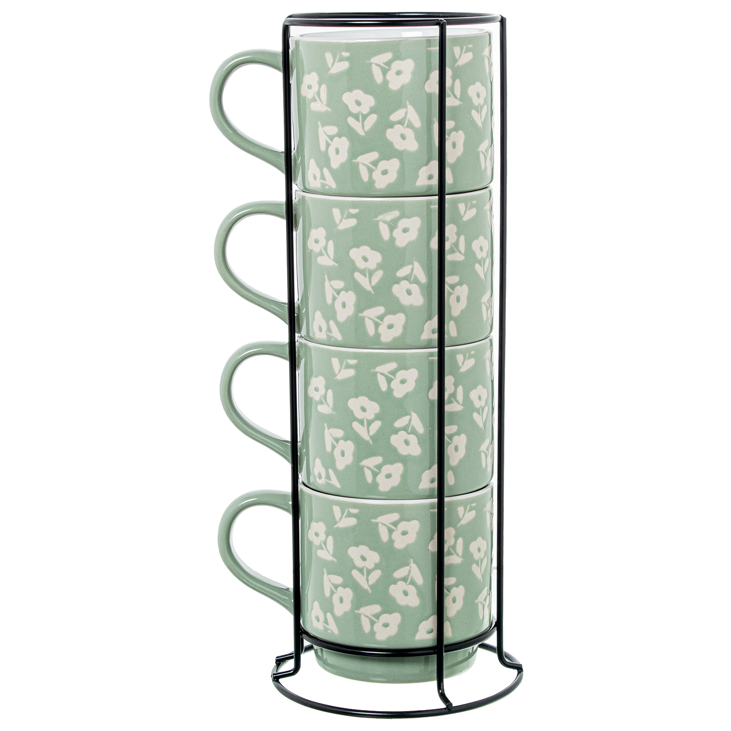 SET 4 MUGS CERÁMICA VERDE FLORICA COLOR ROSA C/SOPORTE METAL _MUG:355ML ø9X9CM