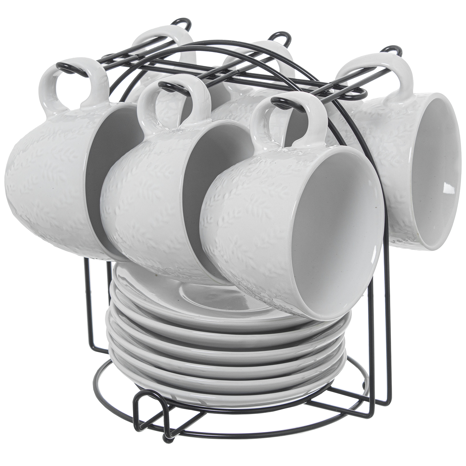 SET 6 TAZAS TÉ C/PLATO CERÁMICICA BLANCA C/SOPORTE METAL NEG
