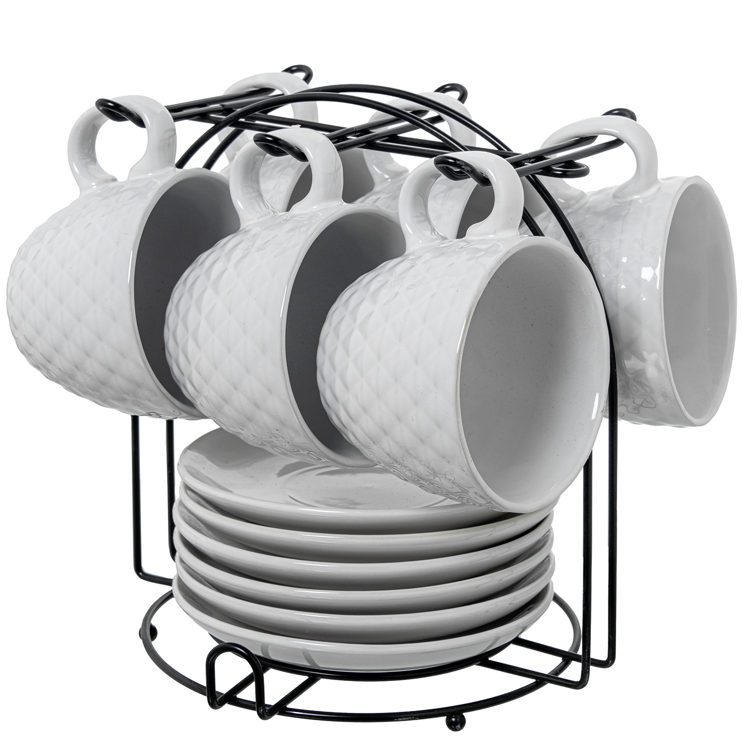 SET 6 TAZAS TÉ C/PLATO CERÁMICICA BLANCA C/SOPORTE METAL NEG