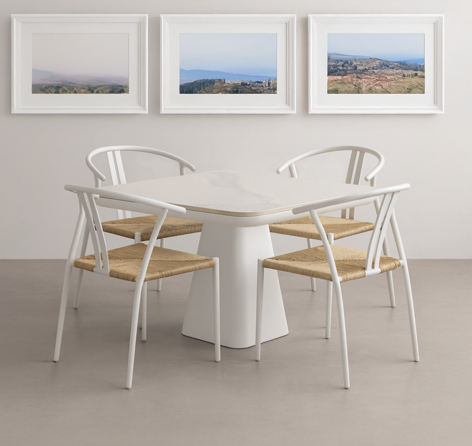 Sillón Chic de la colección exterior Majestic Garden. Fabricado en aluminio, cuerda. con acabados en color blanco y antracita y natural. Respaldo trenzado con cuerda de color antracita. Asiento trenzado de enea color natural. Medidas: 59x60x80 cm.