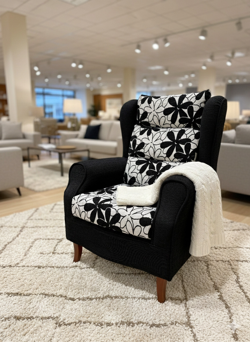 Este sillón orejero de diseño contemporáneo combina a la perfección el confort clásico con un estilo visual atrevido, ideal para crear un rincón de lectura con personalidad. Características Destacadas: Tapizado Exclusivo: Presenta un elegante contraste entre la estructura en negro liso y un llamativo estampado floral bicolor en el asiento y el respaldo. Máximo Confort: Respaldo ergonómico con divisiones acolchadas que aseguran un apoyo óptimo para la espalda y la cabeza. Detalles de Calidad: Incluye reposabrazos curvos de estilo clásico y patas de madera en tono natural que aportan calidez y estabilidad. Versatilidad: Su estética moderna encaja tanto en salones vanguardistas como en dormitorios que buscan un toque acogedor. Medidas: Alto respaldo 106 cm · Alto asiento 47 cm · Ancho 78 cm