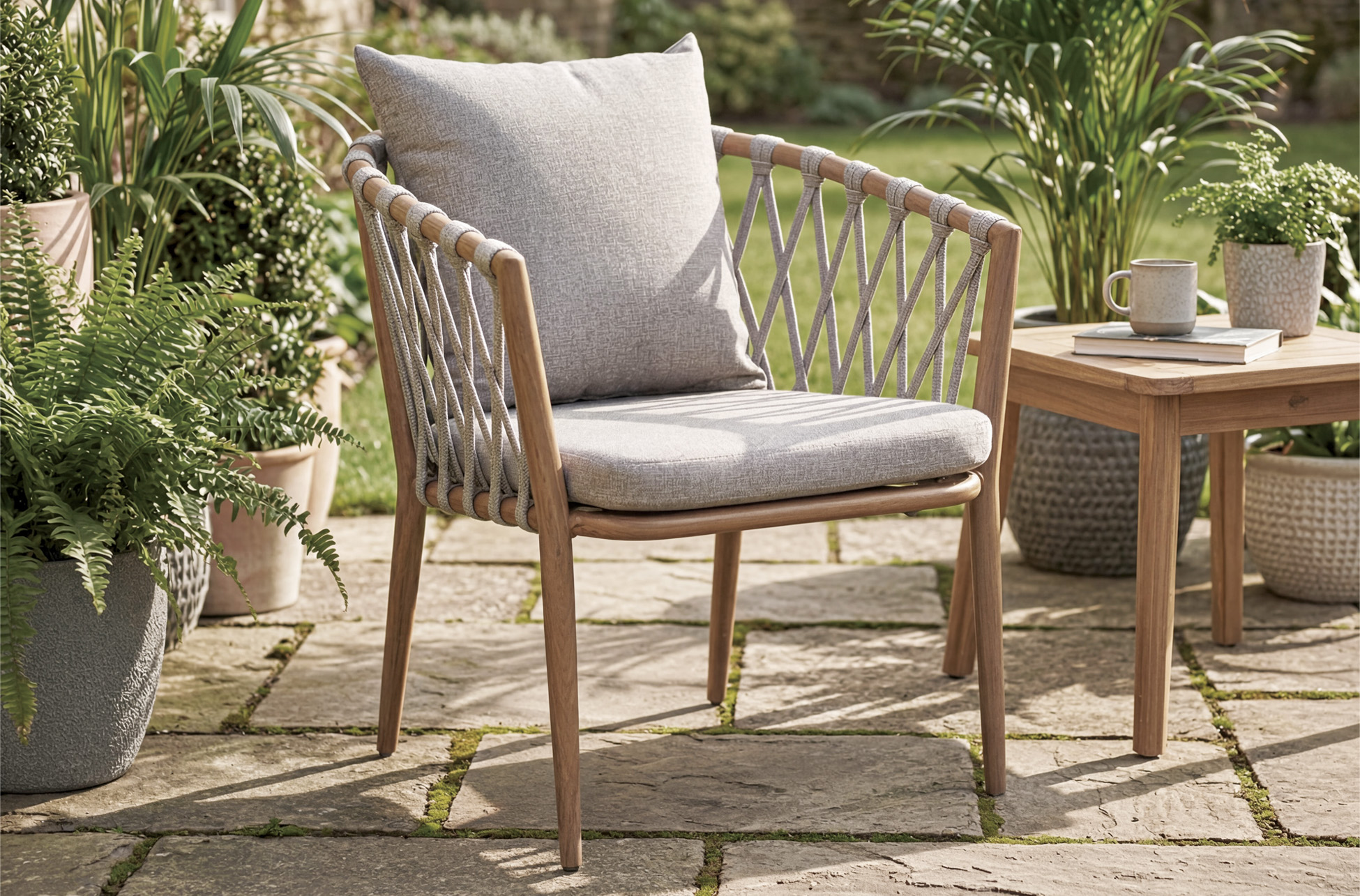 Respaldo decorativo trenzado en cuerda.