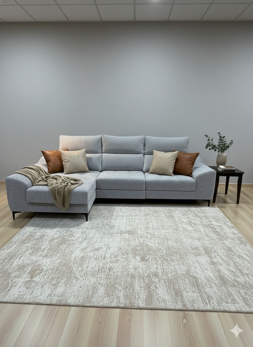 La composición incluye una chaise longue amplia, ideal para estirar las piernas y disfrutar de una zona de relax dentro del propio sofá.