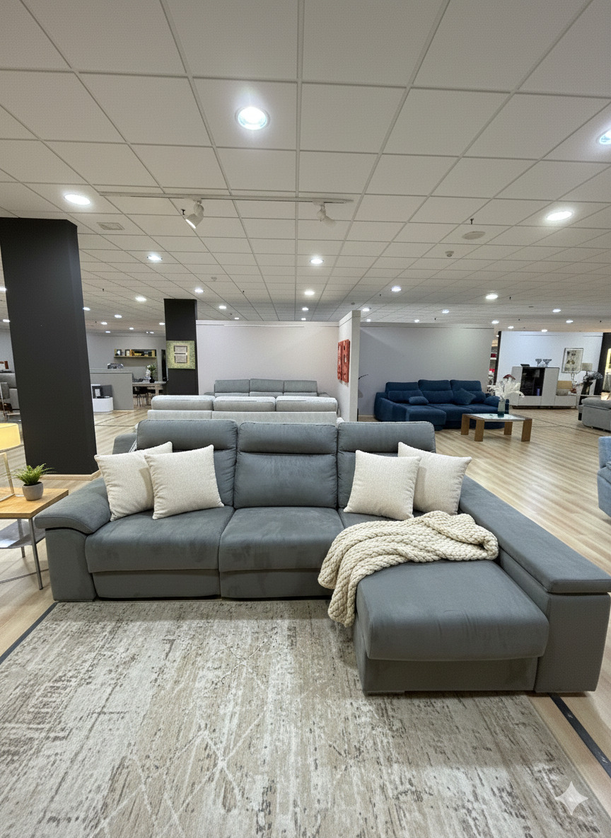 Sofá Málaga disponible en Muebles Hermógenes Cartagena. Incluye chaise longue + 2 relax motorizados + doble arcón. Modelo pensado para confort real, uso diario y disponibilidad inmediata en outlet.