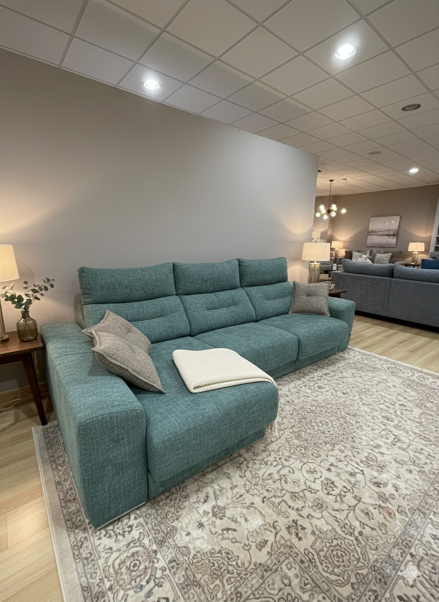 Sofá Río disponible en Muebles Hermógenes Cartagena. Incluye chaise longue + 2 asientos bandeja + cabezales reclinables + almacenaje. Modelo pensado para confort real, uso diario y disponibilidad inmediata en outlet.