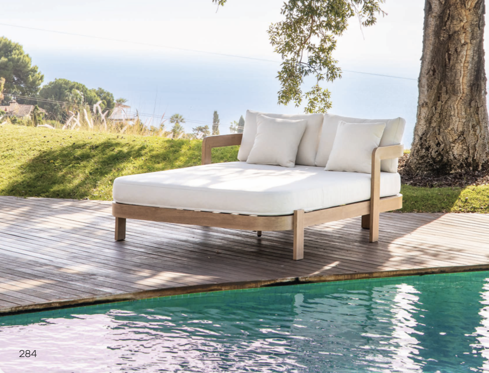 Tumbona Córcega de la colección exterior Majestic Garden. Fabricado en aluminio, madera, olefina. con acabados en color beige. Cojinería de Olefina en olor beige. Respaldo reclinable de forma individual e independiente cada lado. Medidas: 191x144x60 cm.