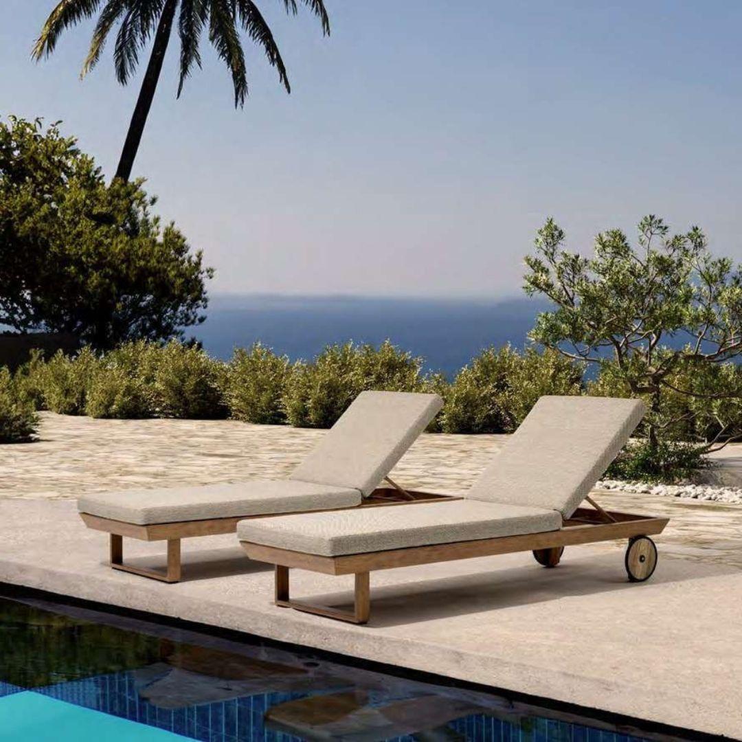 Tumbona de jardín Masái fabricada en aluminio imitación madera. Con ruedas traseras y cojinería color topo.
