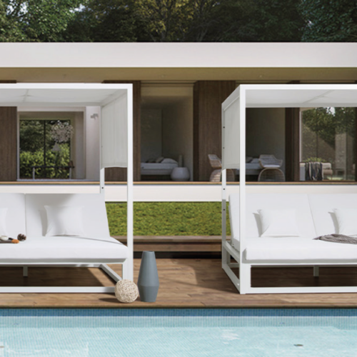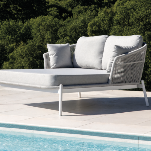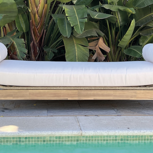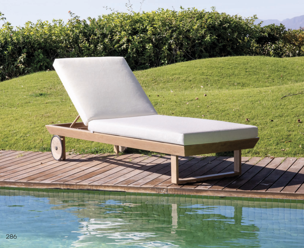 Tumbona Masai de la colección exterior Majestic Garden. Fabricado en aluminio, madera. con acabados en color beige. Ruedas traseras. Disponible mesa auxiliar Masai diseñada en aluminio imitación. Medidas: 40x40x45 cm.