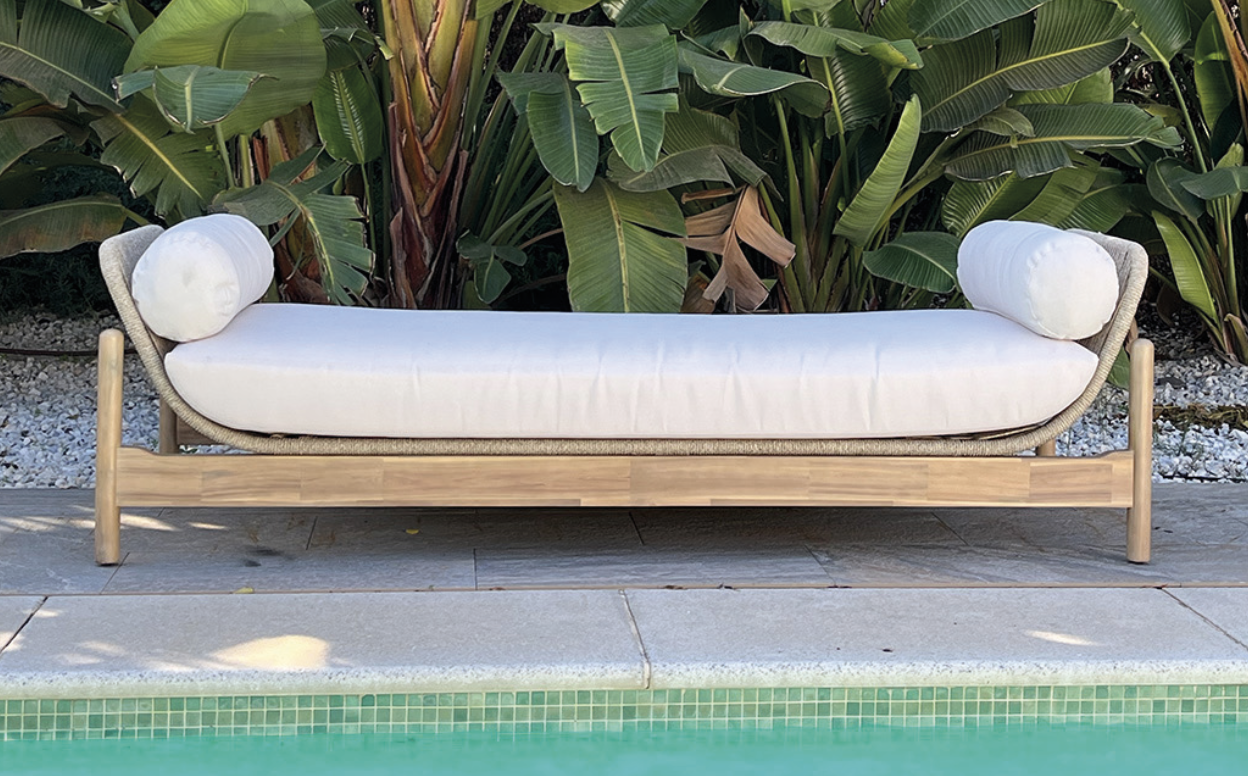 Tumbona Polinesia de exterior fabricado en madera, olefina en color beige y natural cojinería de olefina beige