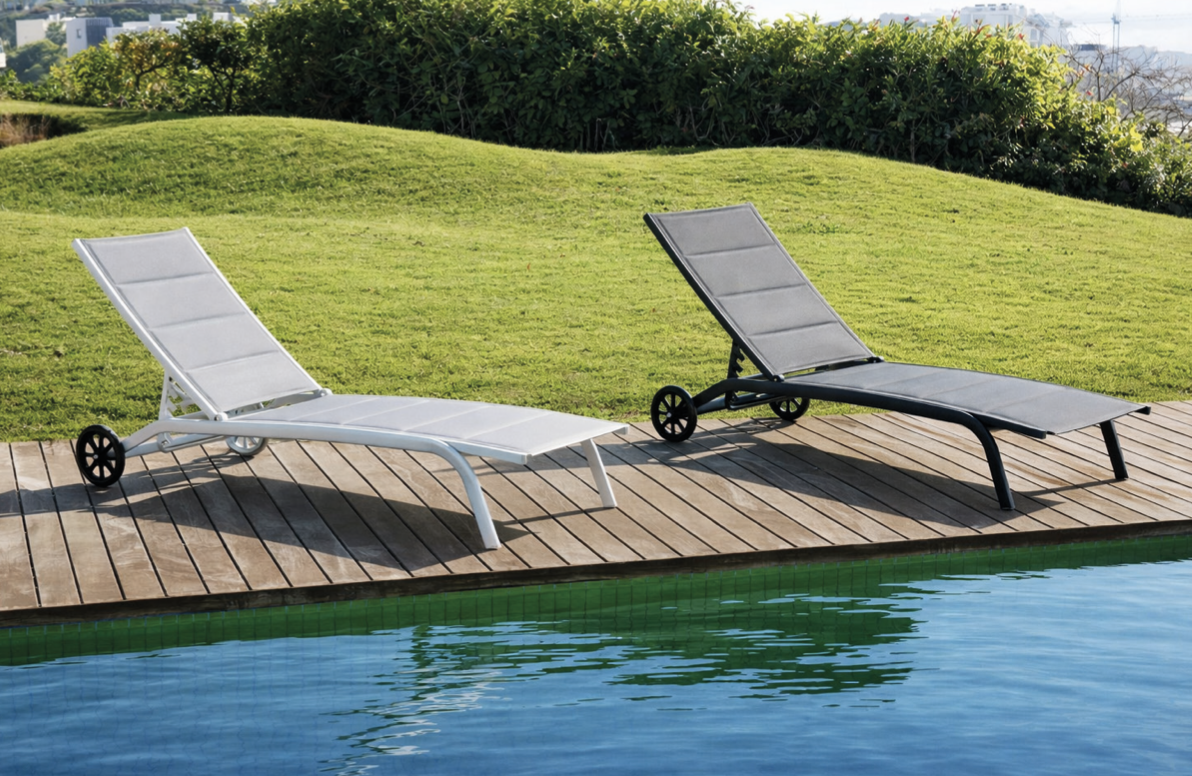 Tumbona Roche de exterior fabricado en aluminio en color blanco y antracita ruedas traseras